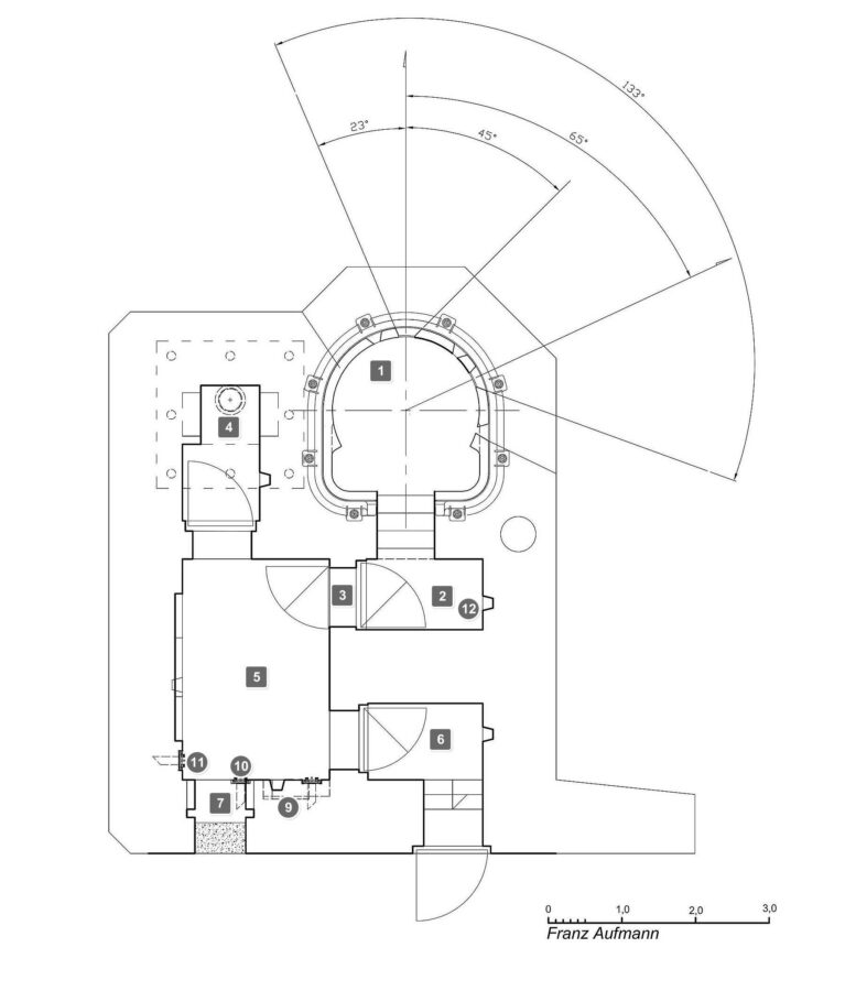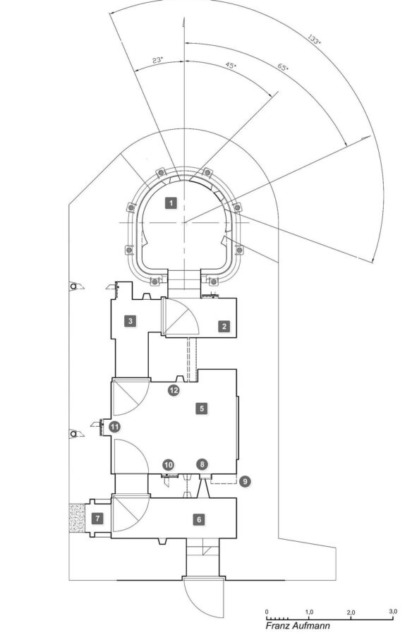 1. stanowisko bojowe w kopule 3aP7, 2. przedsionek (miejsce na skład amunicji), 3. śluza pośrednia, 4. stanowisko obserwatora pod poziomą płytą stropową, 5. izba załogi, 6. śluza wejściowa, 7. wyjście ewakuacyjne, 9. nisza na zakończenie kablowe, 10. przewód wentylacyjny z uniwersalnym zamknięciem, 11. przewód kominowy z uniwersalnym zamknięciem, 12. nisza oświetleniowa.